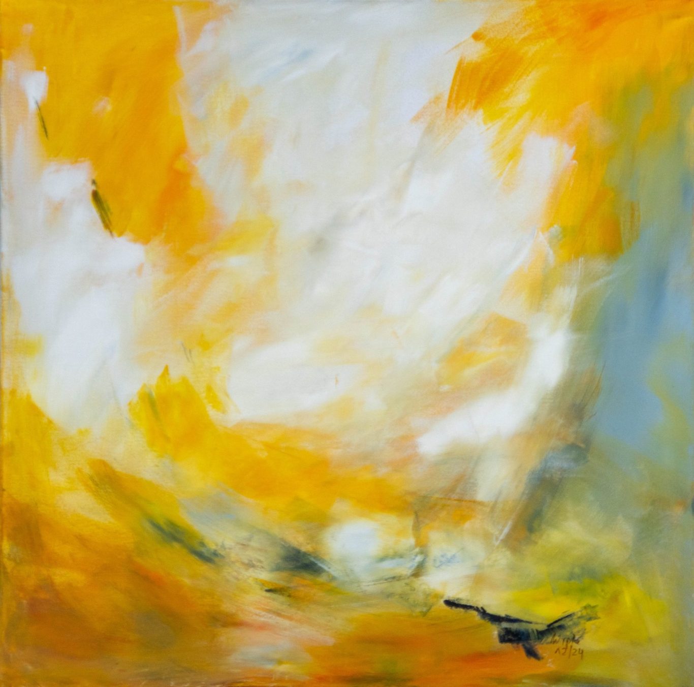 Die Arbeit „Flug ins Licht“ entfaltet einen Bildraum voller Helligkeit, Bewegung und Weite. Leuchtende Gelb- und Orangetöne durchziehen die Komposition wie ein strahlender Himmel oder ein aufbrechendes Morgenlicht. Weiße, wolkenartige Flächen öffnen den Raum und lassen das Bild beinahe schwerelos wirken.