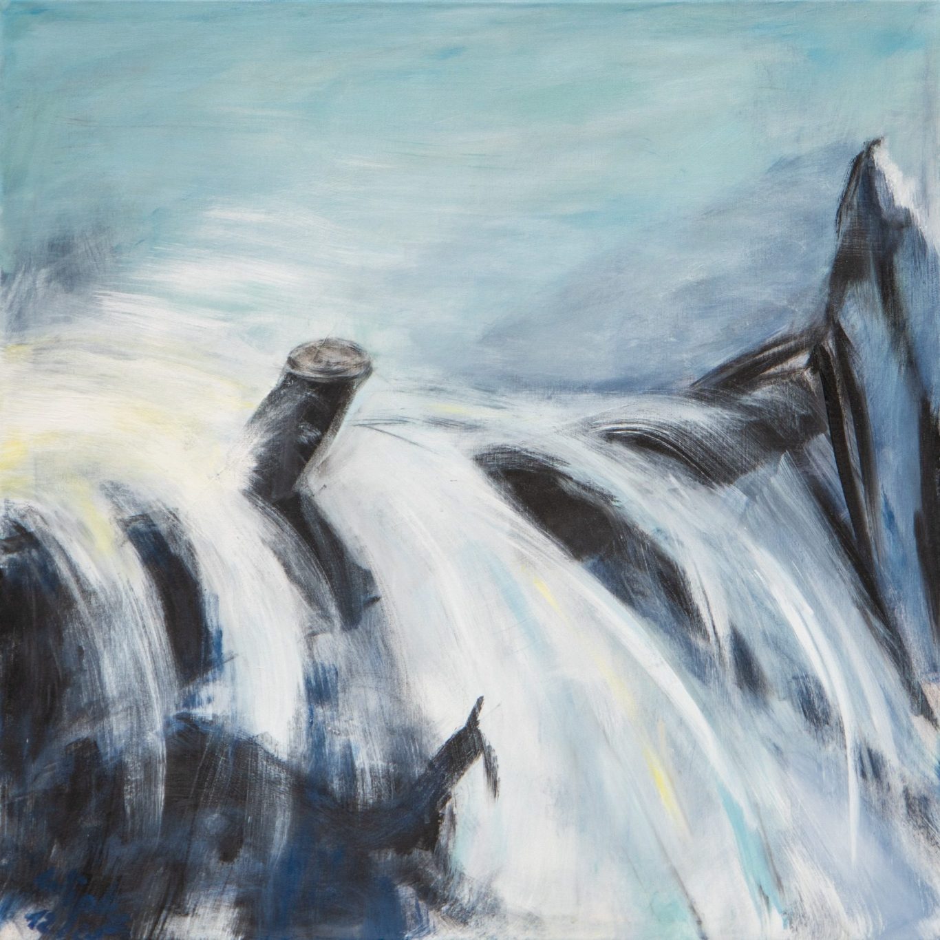 In der Arbeit „Am Rand des Falls“ begegnen sich Kraft und Stille. Ein Wasserfall stürzt in breiten, weißen Strömen über dunkle Felsen in die Tiefe. Die Bewegung des Wassers ist nur angedeutet, doch gerade diese reduzierte Darstellung lässt die Energie des Moments spürbar werden.