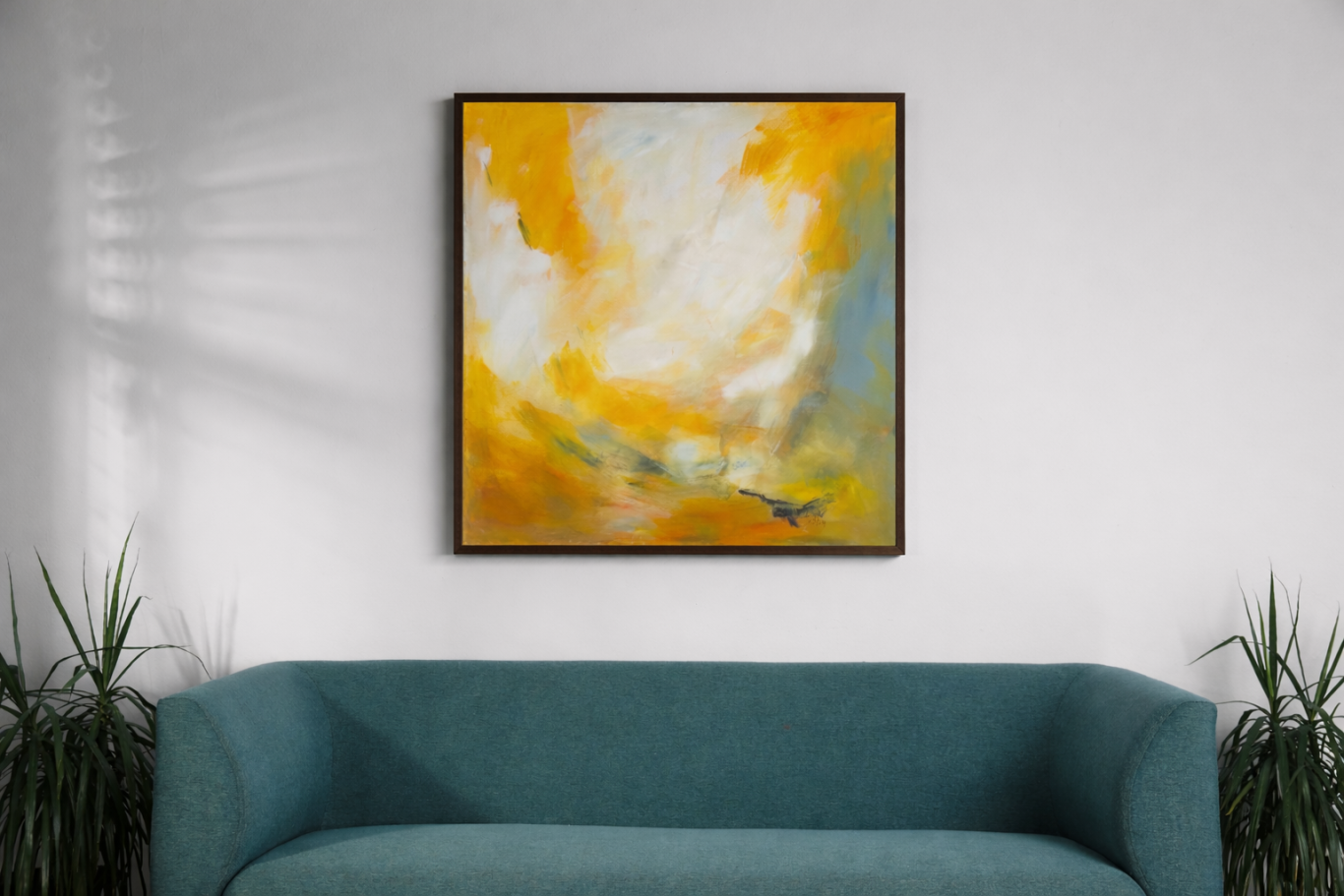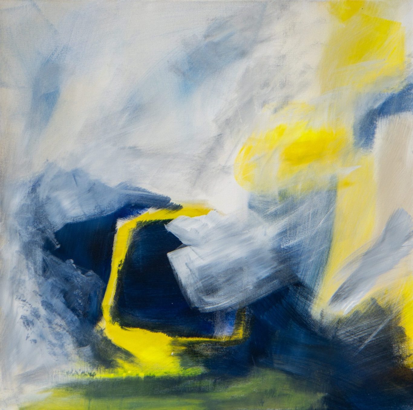 Die breiten, gestischen Pinselbewegungen erzeugen Dynamik und verleihen dem Bild eine spürbare innere Bewegung. Zwischen den dunklen, kompakten Flächen und den hellen, fast transparenten Bereichen entsteht ein Spiel aus Verdichtung und Auflösung. Das Gelb wirkt dabei wie ein Signal – ein Moment von Klarheit, der sich aus der Tiefe heraus entwickelt.