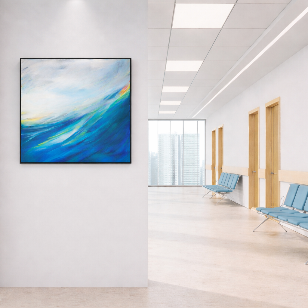 Zwischen Abstraktion und Naturassoziation entsteht eine atmosphärische Landschaft, die weniger einen konkreten Ort zeigt als ein Gefühl: die Kraft des Meeres, den Moment einer sich aufbauenden Welle und das Spiel von Wasser, Wind und Licht. Das Bild lädt den Betrachter ein, sich in diese Bewegung hineinziehen zu lassen – dorthin, wo Farbe zu Rhythmus und Raum zu Bewegung wird.