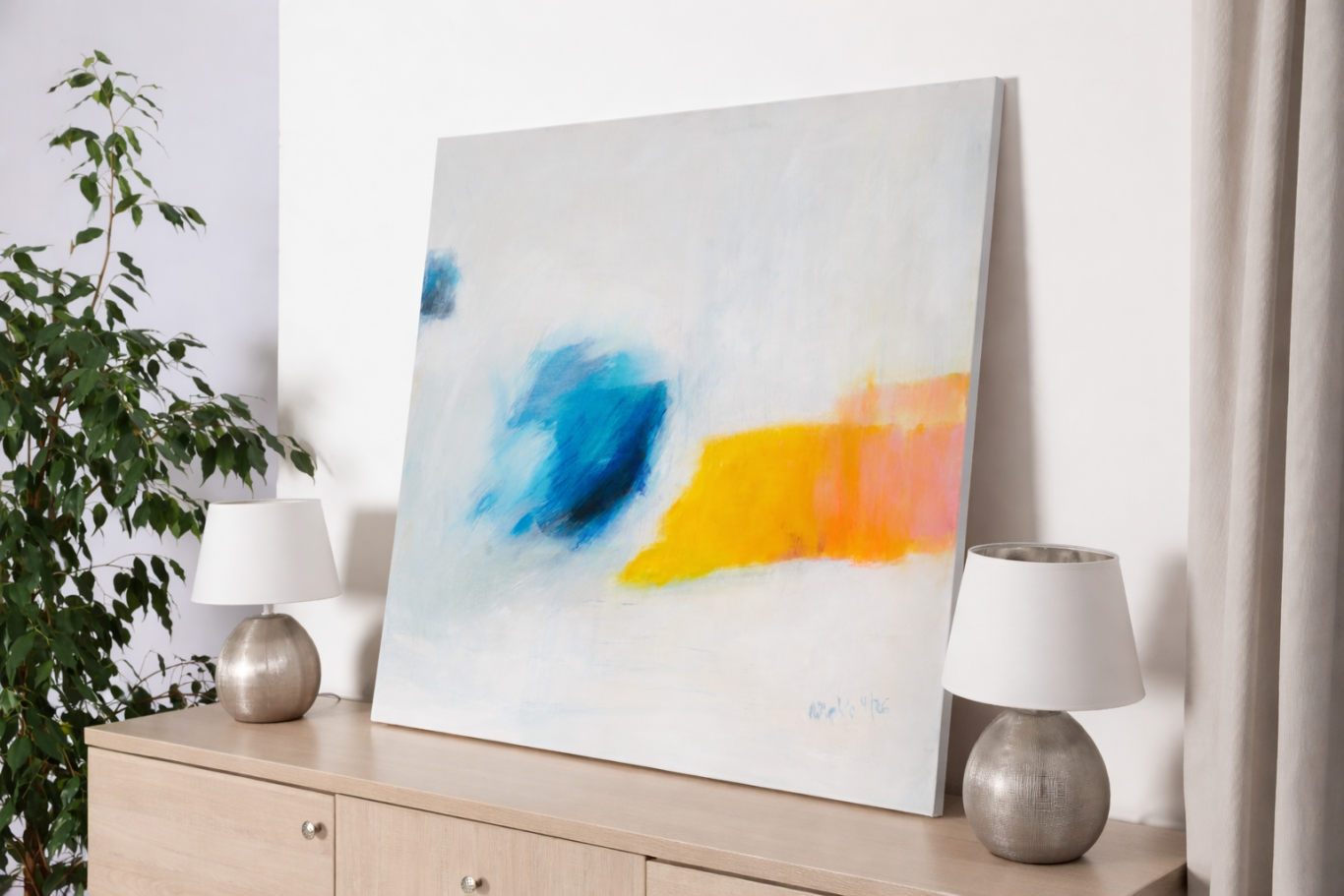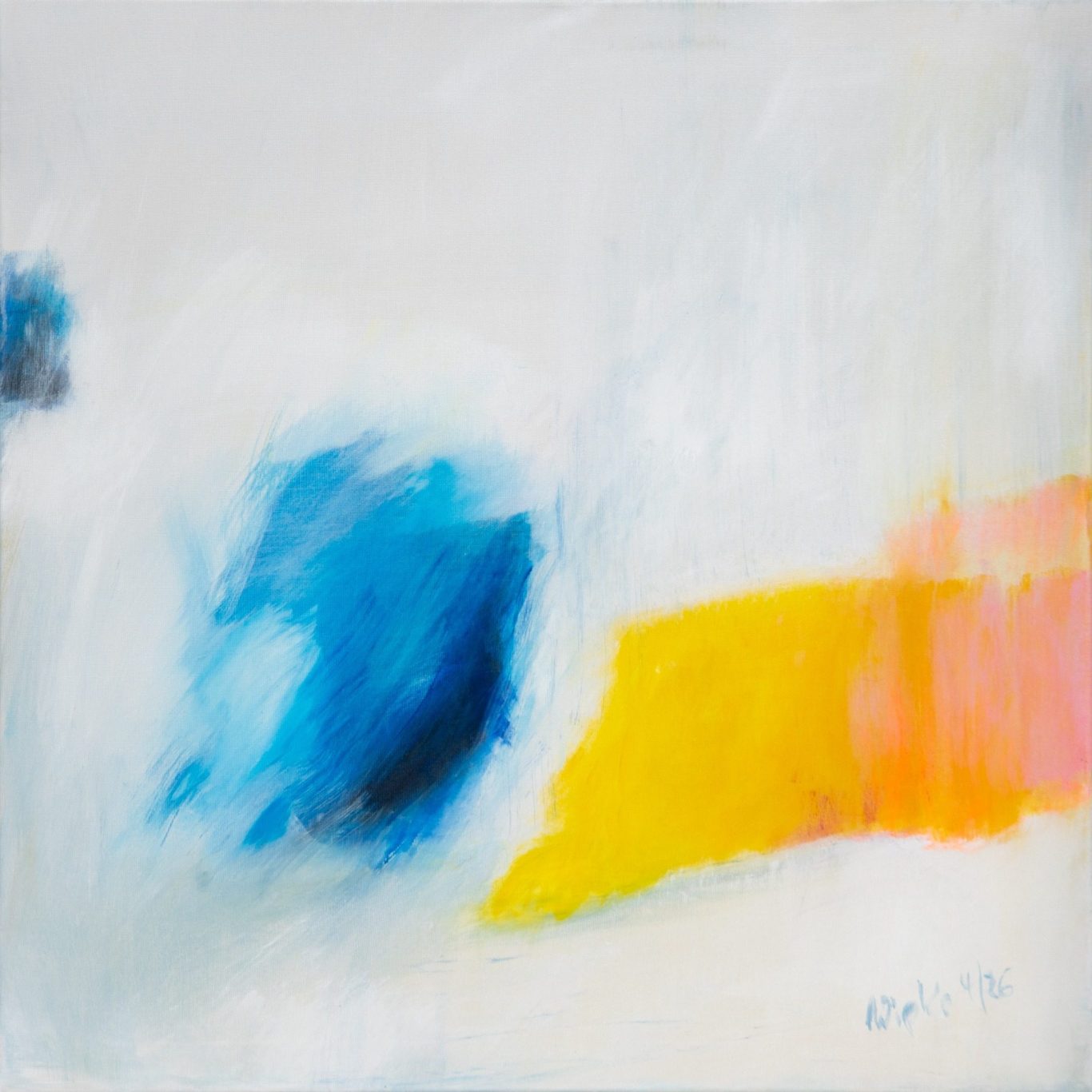 In dieser reduzierten abstrakten Komposition begegnen sich zwei farbliche Energien im offenen Bildraum. Ein dynamischer, tiefblauer Farbkörper scheint aus der linken Bildhälfte hervorzutreten, während sich auf der rechten Seite ein leuchtendes Band aus Gelb und Orange bis Rosa horizontal ausbreitet.