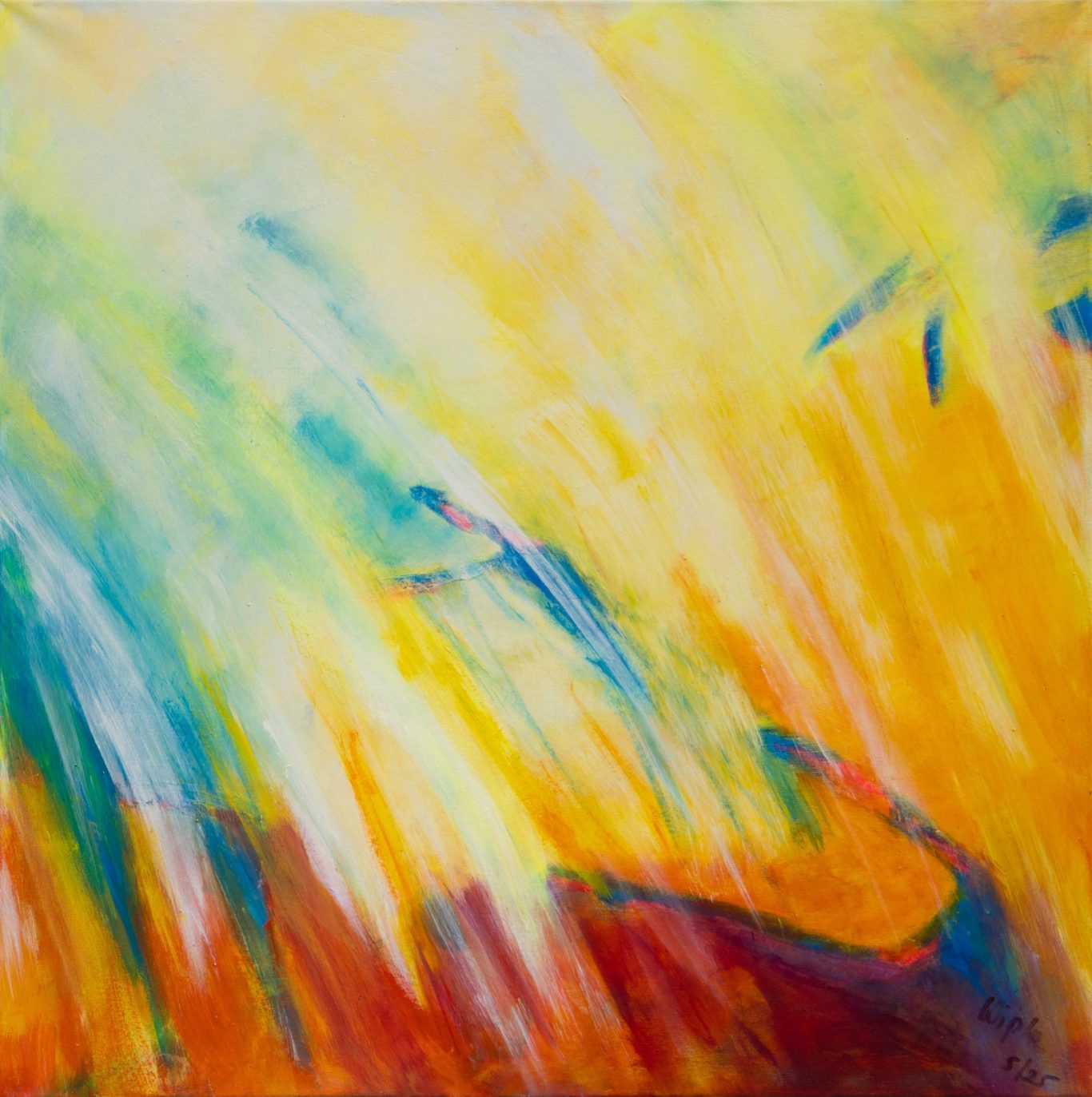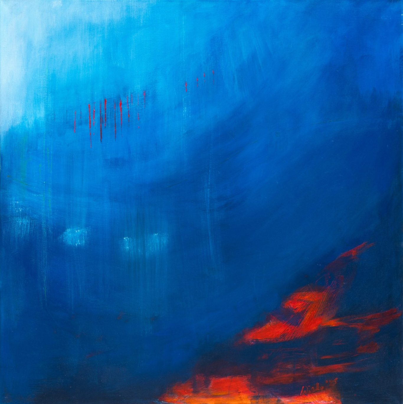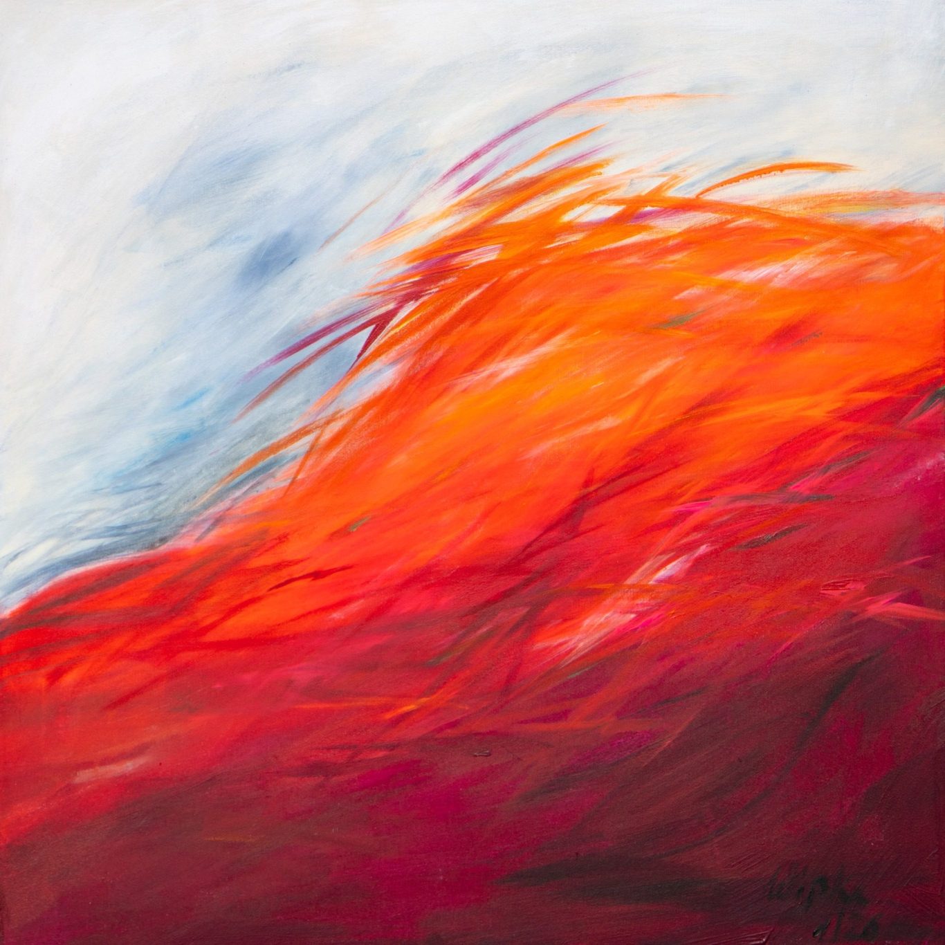 Die gestischen Pinselbewegungen erinnern an Flammen, an aufgewühlte Naturkräfte oder an einen Sturm aus Farbe. Gleichzeitig bleibt das Bild offen und poetisch: Zwischen den kräftigen Farbräumen blitzen kühlere Blau- und Weißtöne auf, die der Komposition Raum und Tiefe verleihen.