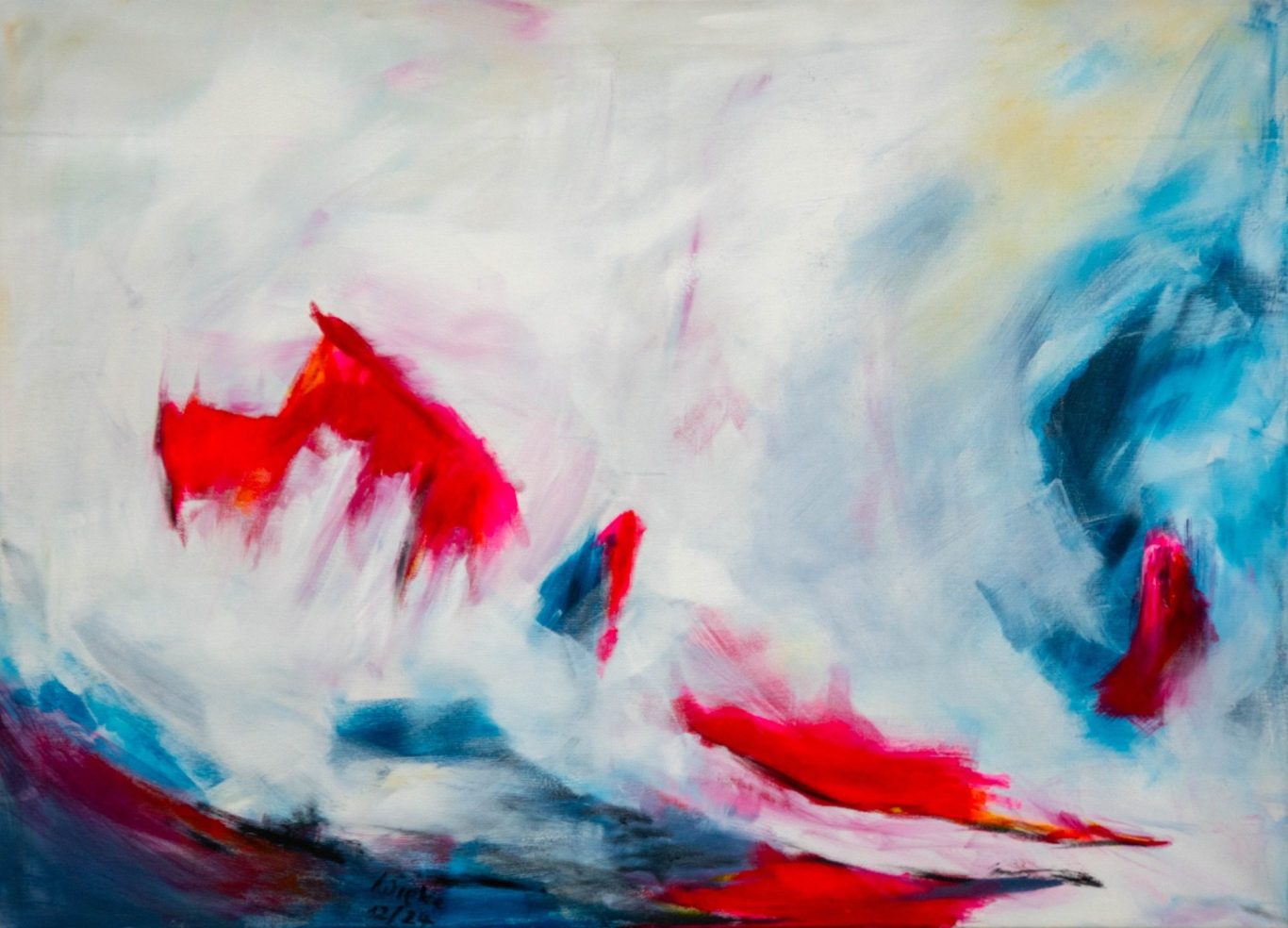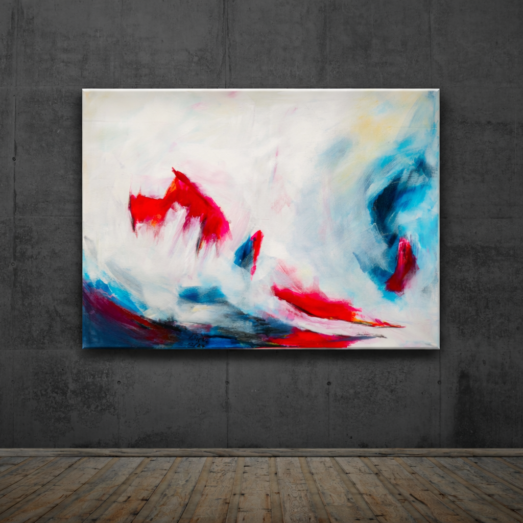 Während die roten Flächen Impuls, Wärme und emotionale Intensität andeuten, erzeugen die kühlen Blautöne eine fließende Dynamik, die den Blick durch das Bild führt. Der großzügige Weißraum fungiert dabei nicht als Leere, sondern als aktiver Gegenpol – ein Raum, in dem sich Bewegung entfalten kann.