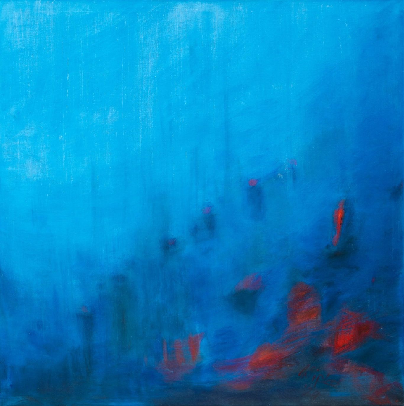 Das Werk bewegt sich an der Grenze zwischen Abstraktion und Andeutung von Landschaft. Die kräftigen roten Formen erinnern an flüchtige Erscheinungen oder emotionale Markierungen im Raum, während die kühlen Blau- und Grautöne Tiefe und Weite erzeugen. Dadurch entsteht ein visuelles Spannungsfeld zwischen Dynamik und Kontemplation.