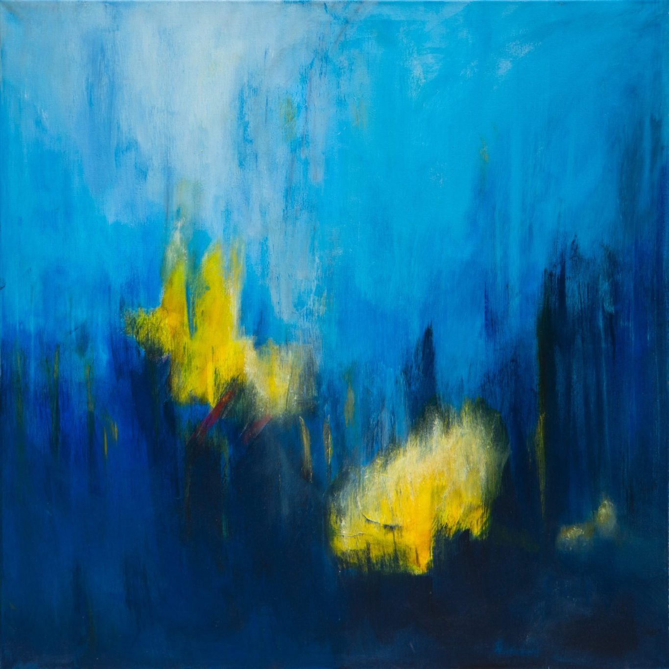 Aus dieser Tiefe treten leuchtende gelbe Formen hervor. Sie erscheinen wie Lichtreflexe, die durch Wasser brechen, wie schwebende Pflanzen oder fragile Formen, die aus der Dunkelheit auftauchen. Diese warmen Farbakzente setzen starke Kontraste und verleihen dem Bild eine poetische Spannung.
