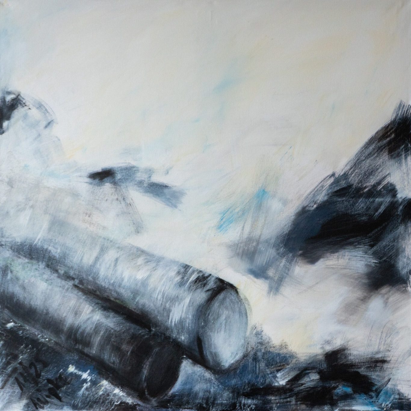 Die Umgebung bleibt bewusst skizzenhaft und offen. Nebelartige Weiß- und Grautöne lösen die Landschaft fast auf, während dunkle, kraftvolle Pinselspuren Berge, Felsen oder Waldränder andeuten. Dadurch entsteht ein Spannungsfeld zwischen konkretem Gegenstand und aufgelöster Umgebung.