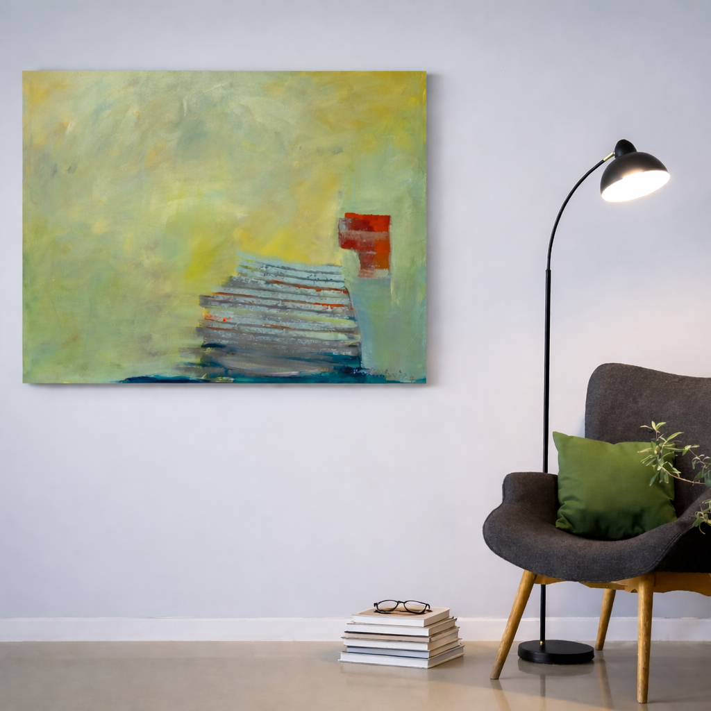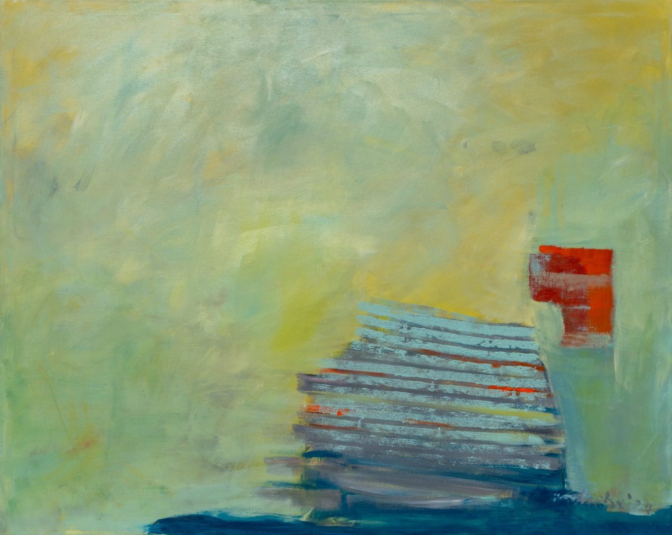 Eine weite, von sanften Gelb- und Grünnuancen durchzogene Fläche bestimmt den Bildraum und erzeugt eine ruhige, beinahe atmosphärische Stimmung. Am rechten Bildrand verdichten sich die Formen: Horizontale Linien erinnern an gestapelte Planken, an Stufen oder an die konstruktive Struktur einer Kaimauer. Ein kleines rotes Element setzt einen prägnanten Akzent und wirkt wie ein Signalpunkt im ansonsten stillen Raum.