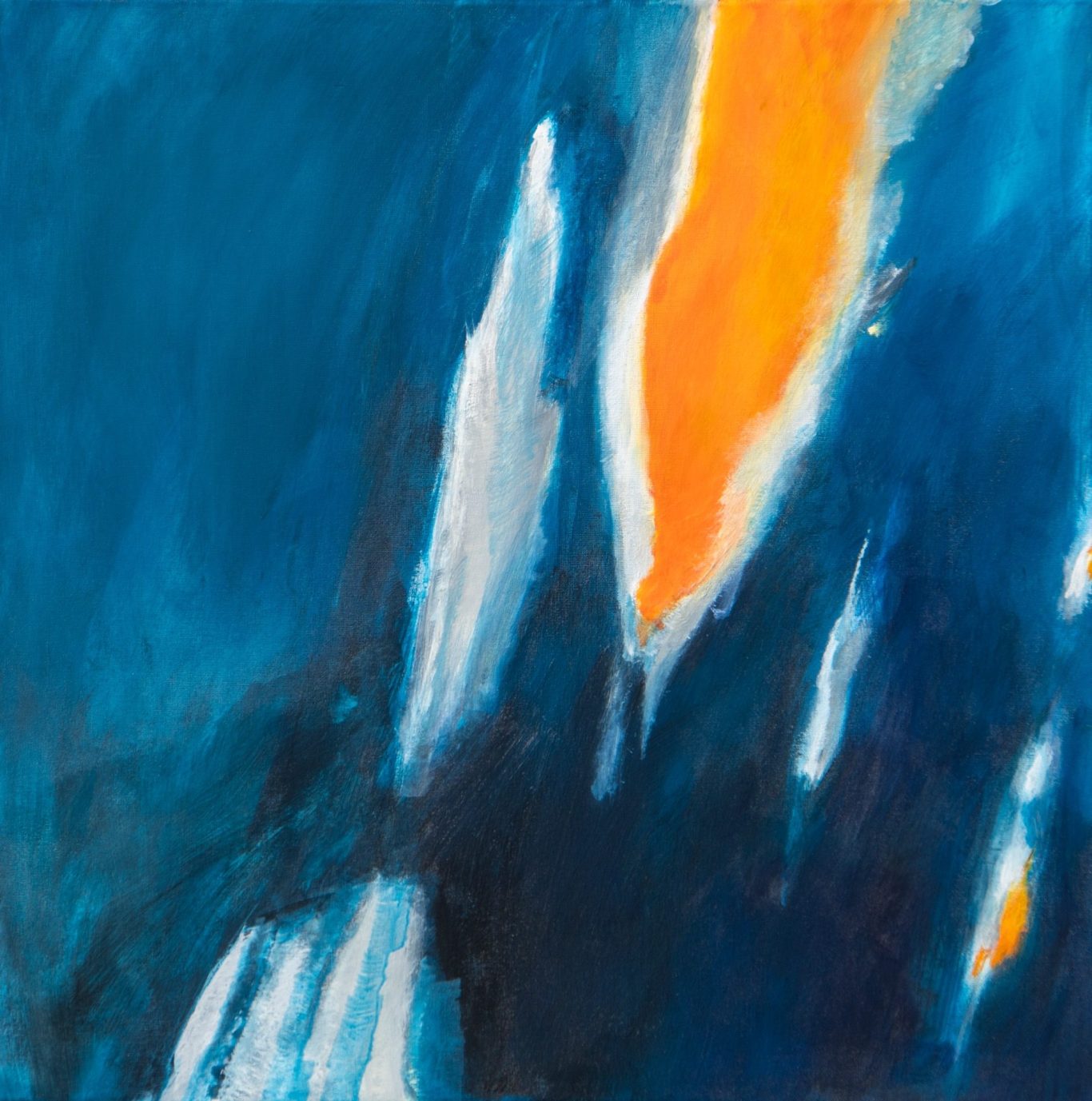 Die Arbeit „Lichtspur im Blau“ entfaltet eine atmosphärische Spannung zwischen Tiefe und Leuchten. Ein weiter, dunkler Blauraum bildet die Bühne, aus der sich helle und warme Farbakzente lösen. Besonders das intensive Orange erscheint wie ein Strom aus Licht, der sich durch die kühlen Blautöne nach unten bewegt.