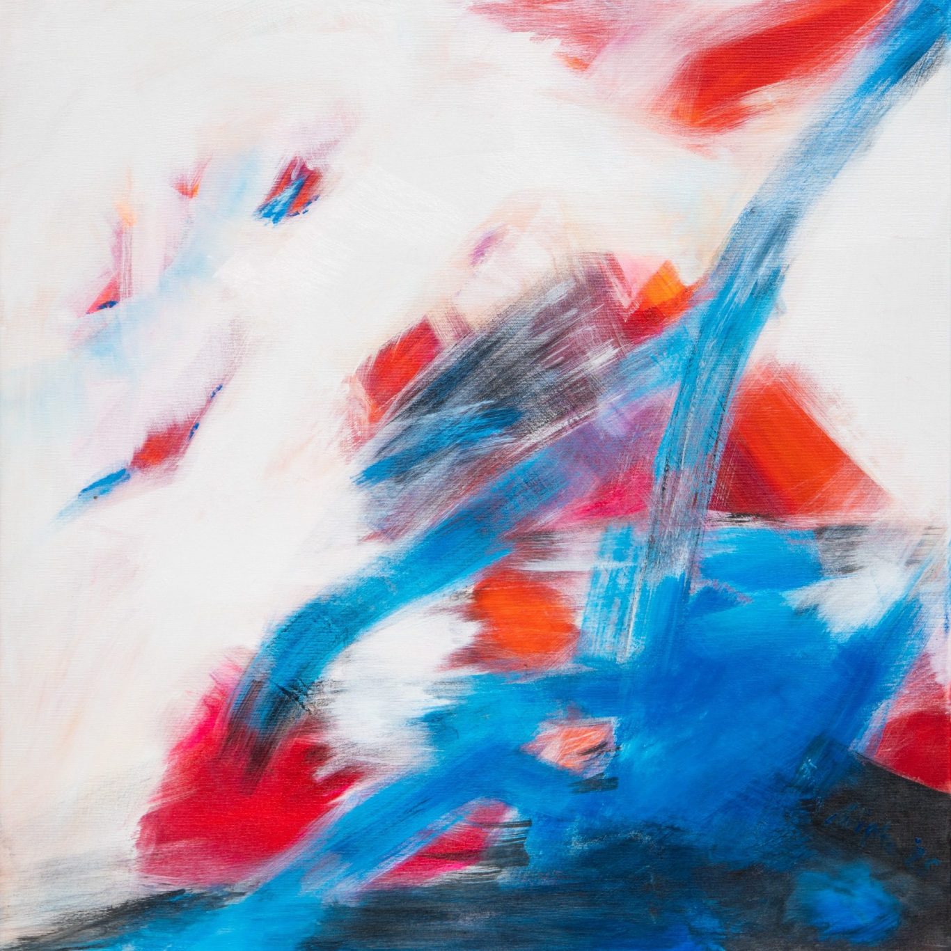 Dieses abstrakte Acrylbild untersucht das Spannungsfeld zwischen Bewegung und Leere. Kräftige Farbströme aus Blau und Rot durchziehen die helle Bildfläche und wirken wie energetische Bahnen, die sich kreuzen, überlagern und wieder auflösen.