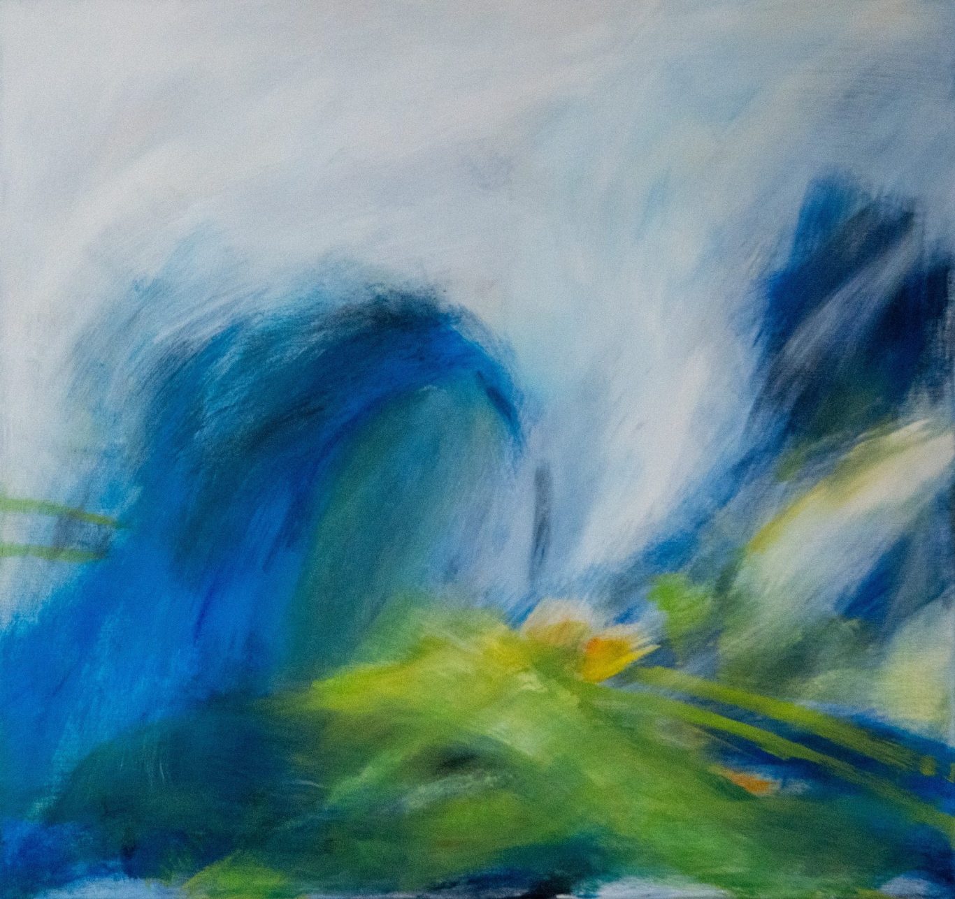Aus diesem Zentrum heraus leuchtet ein warmer Farbpunkt in Gelb und Orange – ein kleines, intensives Licht, das dem Bild einen Fokus gibt und den Blick des Betrachters anzieht. Die kühlen Blau- und Grüntöne erzeugen dabei eine Atmosphäre von Tiefe und Frische, während die hellen, fast nebelhaften Bereiche den Bildraum öffnen.