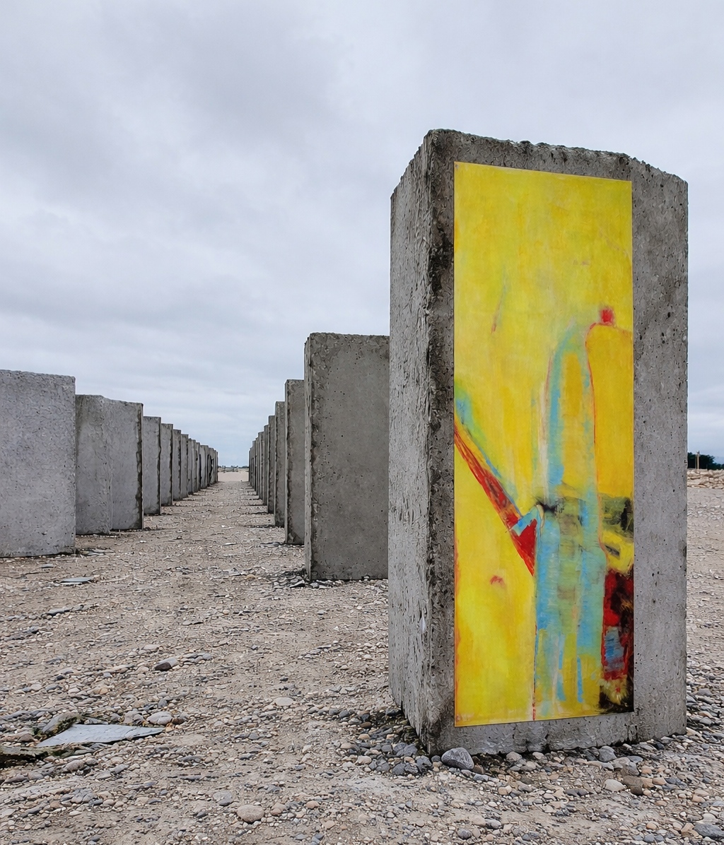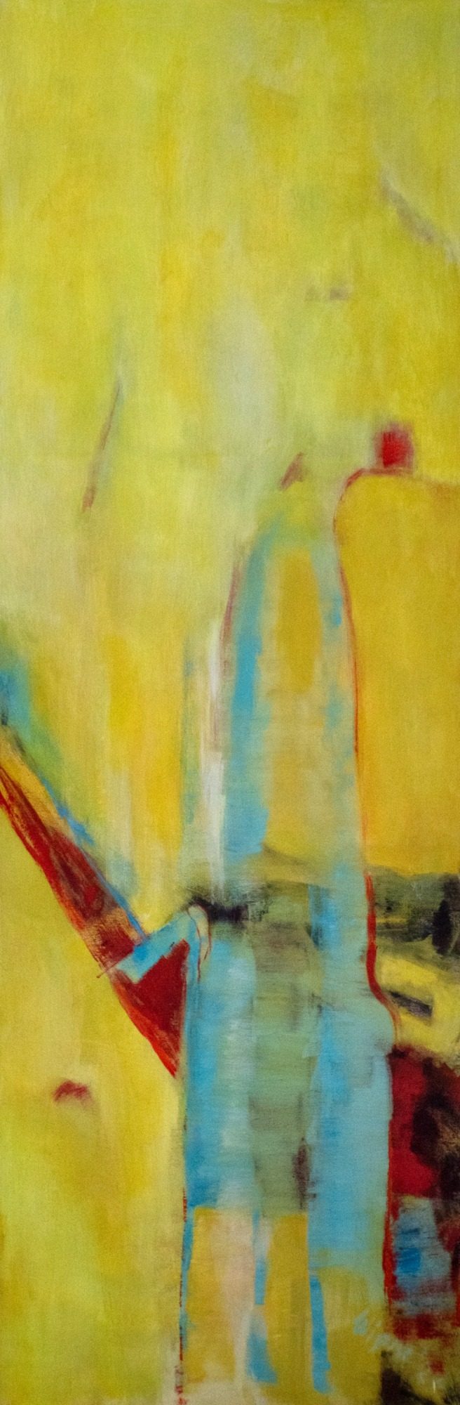 Eine leuchtende Gelbfläche dominiert die Bildkomposition und erzeugt ein vibrierendes, beinahe atmosphärisches Feld. Aus dieser farbintensiven Umgebung treten vertikale, blau getönte Formen hervor, die zwischen Figur und architektonischer Struktur oszillieren. Eine diagonale rote Linie durchschneidet den Raum und wirkt wie eine visuelle Zäsur – ein Moment der Spannung innerhalb der ruhigen Farbflächen.