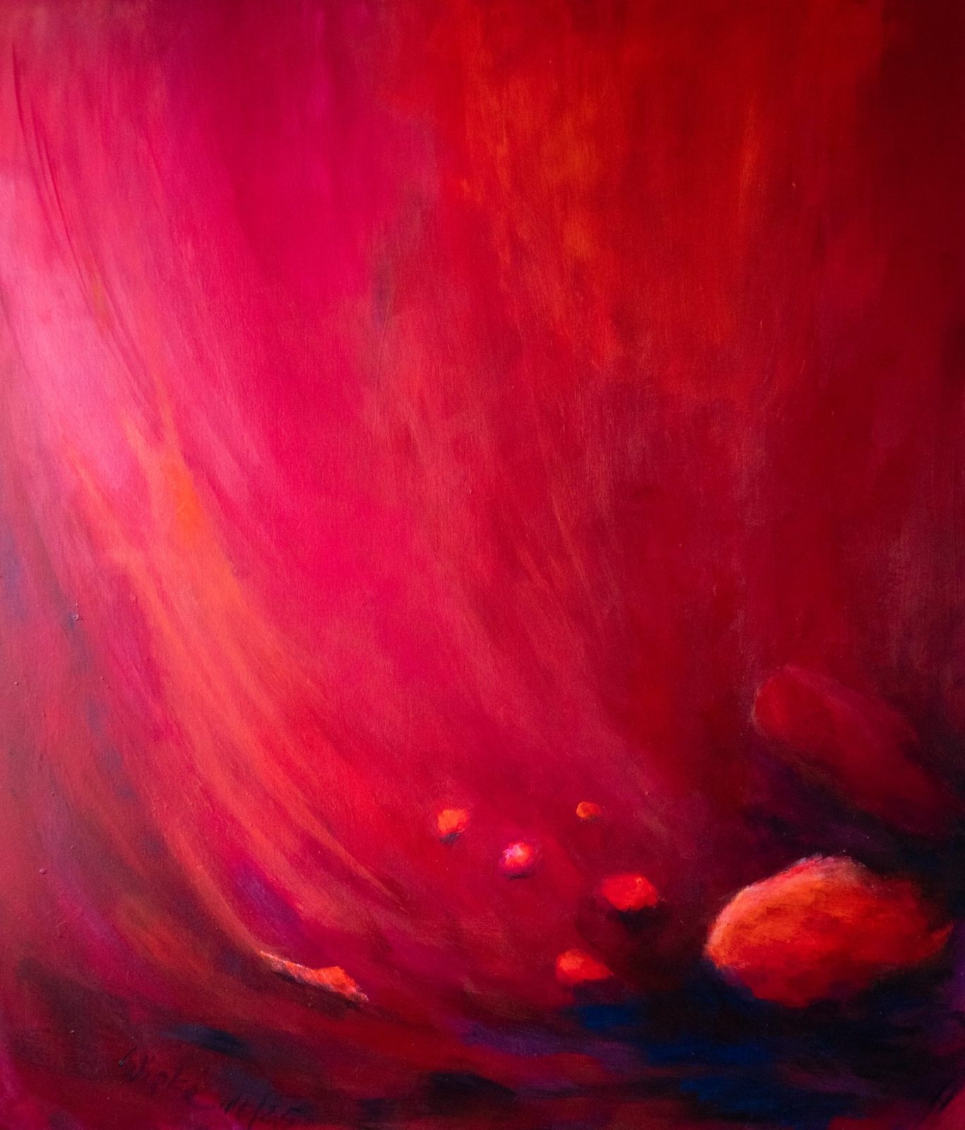 Die Arbeit „Glut im Strom“ ist von intensiver Farbenergie geprägt. Tiefes Rot und leuchtende Karminnuancen durchziehen die Bildfläche wie ein fließender Strom aus Licht und Wärme. Die Farbe scheint sich zu bewegen, zu wirbeln und sich in weichen Übergängen zu verdichten – als würde ein inneres Leuchten aus der Tiefe des Bildes aufsteigen.