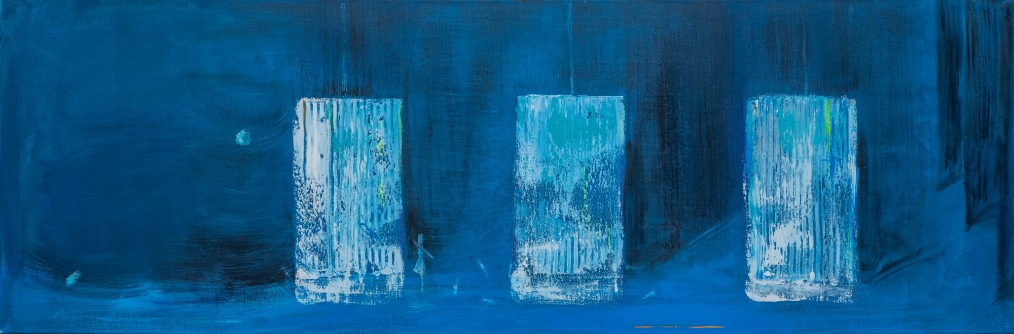 In der Arbeit „Fragmente der Erinnerung“ öffnet sich ein stiller, tiefblauer Bildraum, aus dem drei helle vertikale Formen hervortreten. Sie wirken wie Fenster, Spuren von Architektur oder Lichtzeichen, die aus der Tiefe der Farbe auftauchen. Ihre strukturierte Oberfläche kontrastiert mit den weichen, fließenden Farbschichten des Hintergrunds und erzeugt ein Spannungsfeld zwischen Ordnung und Auflösung.
