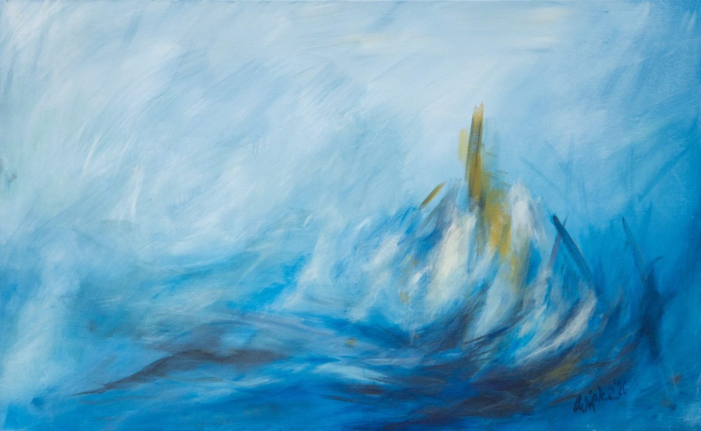 In der Arbeit „Aufbruch im Wind“ verdichten sich Bewegung, Licht und Raum zu einer dynamischen Bildszene. Aus der Weite eines kühlen, atmosphärischen Blaus erhebt sich eine helle, fast leuchtende Form – eine Andeutung von Segeln, die sich im Wind spannen und das Wasser durchschneiden. Die Malerei bleibt bewusst offen und fragmentarisch, sodass zwischen abstrakter Form und maritimer Erinnerung ein schwebender Zwischenraum entsteht.