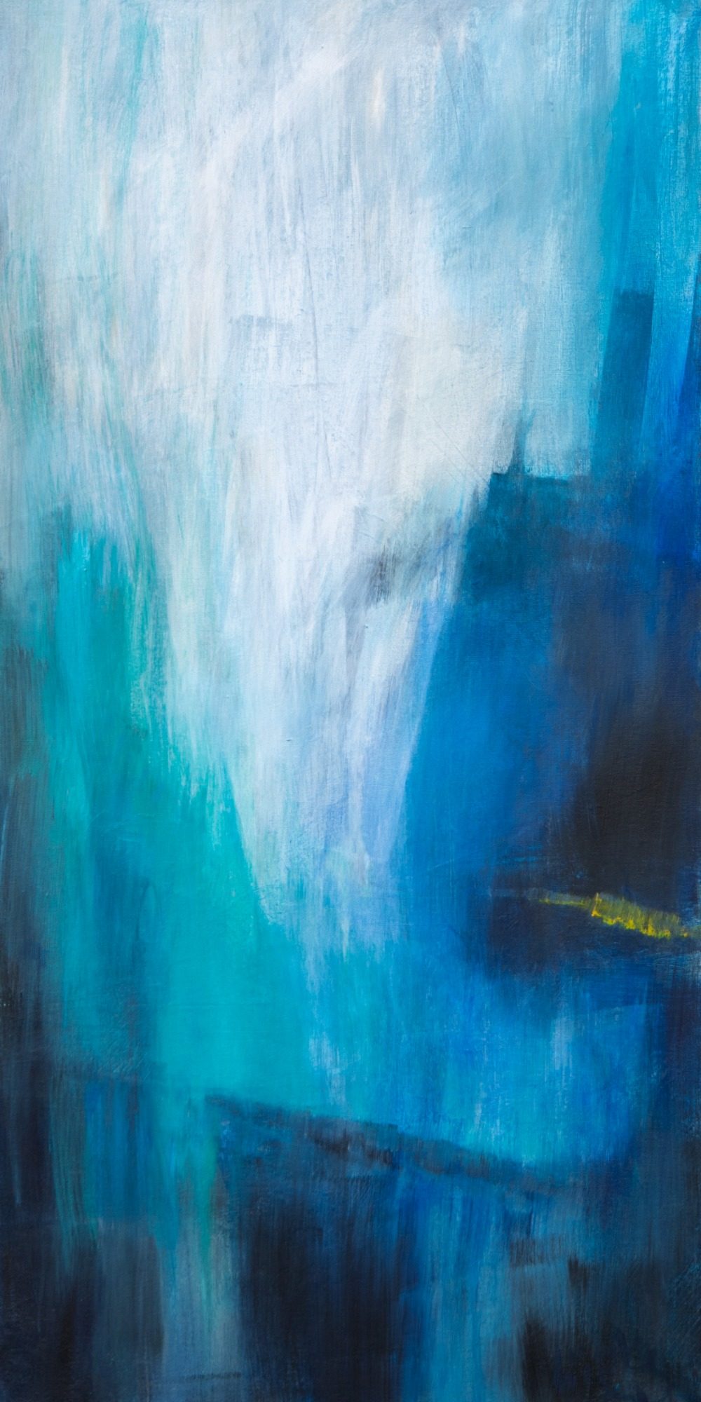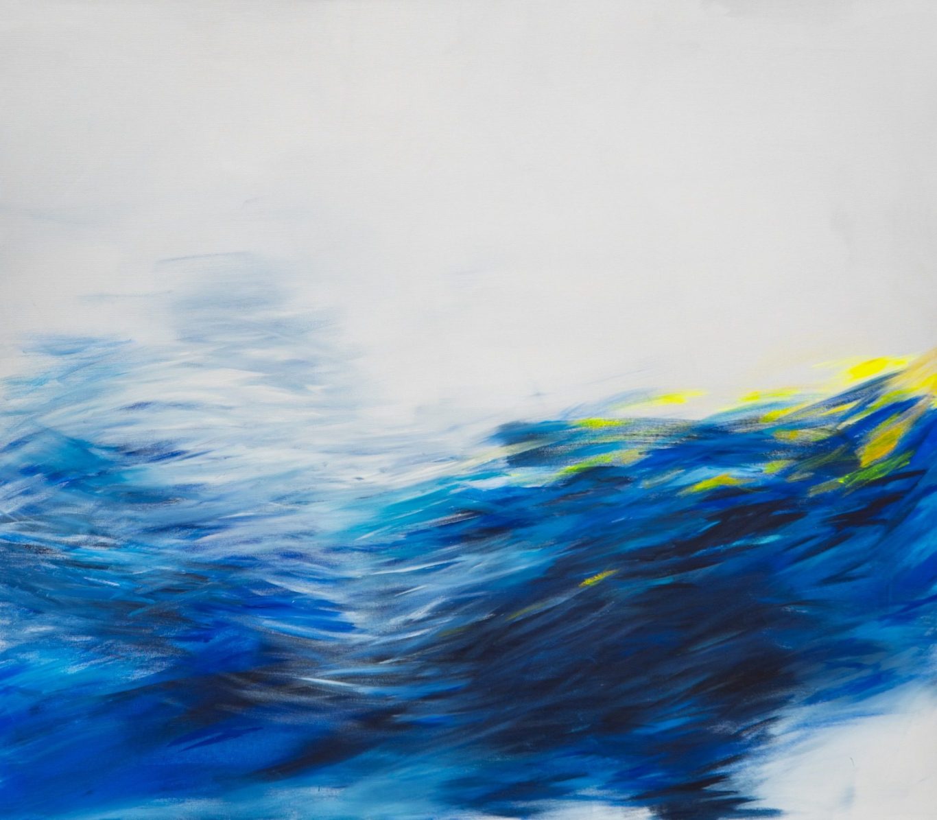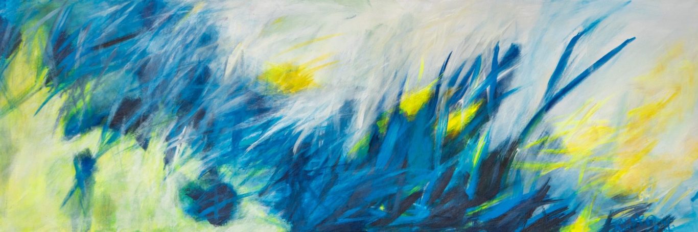 In dieser Arbeit entfaltet sich ein weiter, offener Bildraum, in dem dynamische Blautöne über die Fläche strömen. Die bewegten Pinselspuren erinnern an Wellen, Strömungen oder Wind, der über Wasserflächen zieht. Zwischen den tiefen Blau- und Türkisnuancen brechen helle Gelb- und Weißtöne auf und wirken wie Lichtreflexe, die sich auf der Oberfläche des Wassers spiegeln.