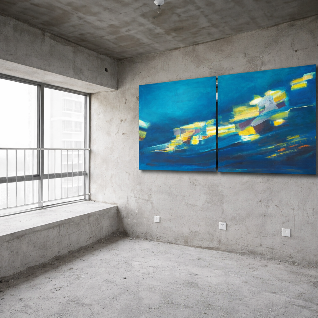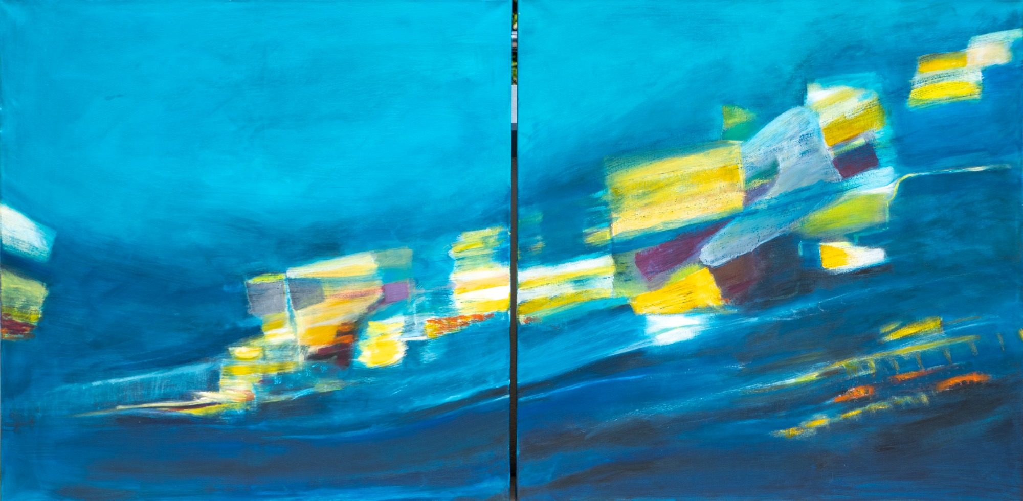 Das Diptychon „Meeresrauschen“ entfaltet eine atmosphärische Bildlandschaft zwischen Bewegung, Licht und Erinnerung. Zwei großformatige Leinwände bilden gemeinsam einen weiten, fließenden Raum, der an nächtliche Küsten, spiegelnde Wasserflächen und ferne Lichter erinnert.