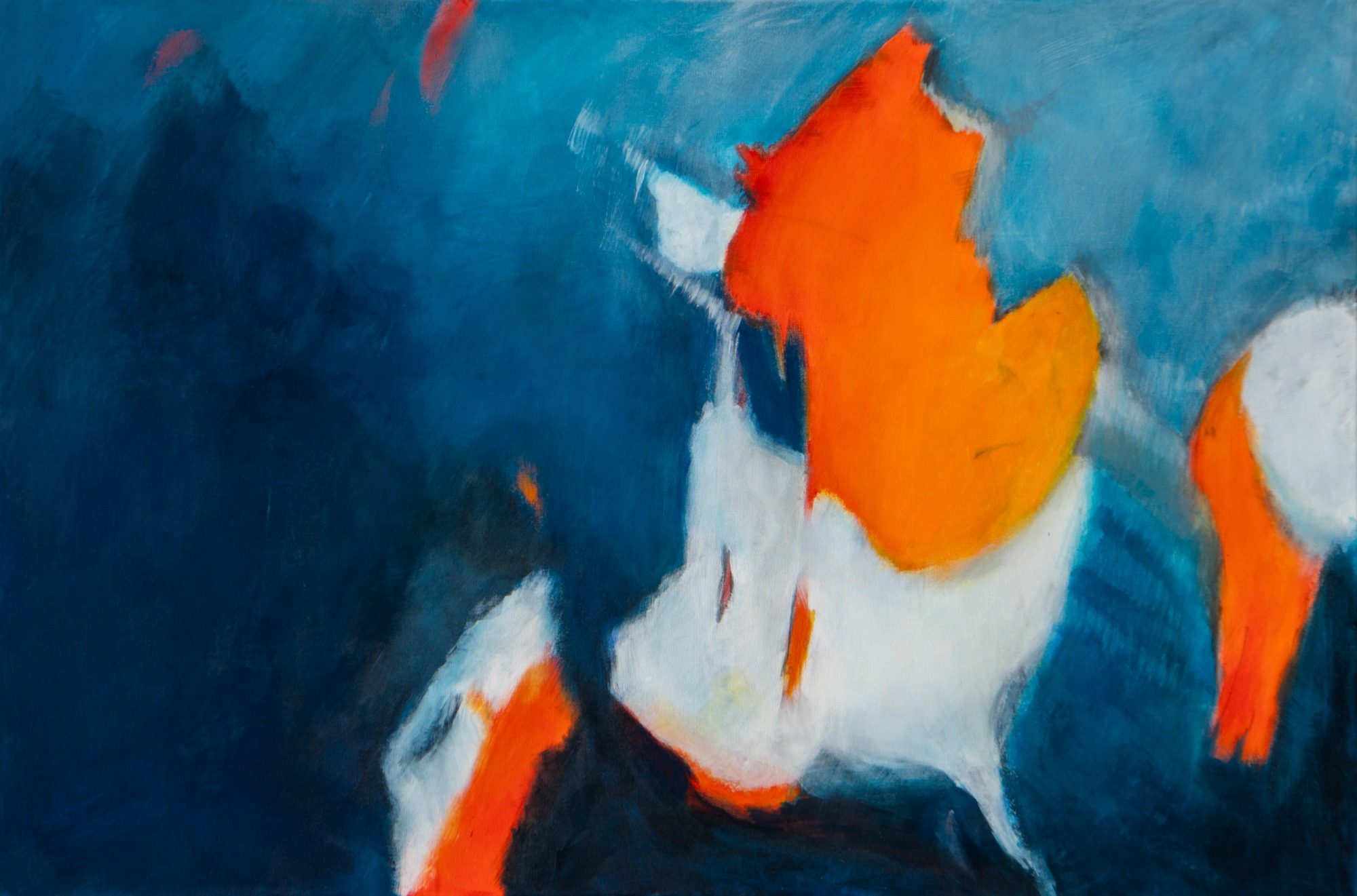 In der Arbeit „Aufstieg der Farbe Orange“ entfaltet sich ein intensiver Dialog zwischen Tiefe und Leuchten. Aus einem dunklen, blauen Bildraum steigt eine kraftvolle Form in Orange und Weiß auf – wie eine Bewegung aus dem Inneren der Farbe selbst. Das warme Orange wirkt lebendig und pulsierend, als würde es sich aus der Dunkelheit heraus befreien.
