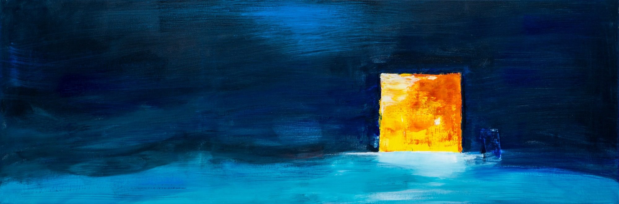 n dieser Arbeit steht ein leuchtendes Rechteck im Zentrum einer weiten, dunklen Bildfläche. Das intensive Gelb-Orange wirkt wie ein geöffnetes Fenster oder ein Durchgang, aus dem Licht in den umgebenden Raum strömt. Die umgebenden Blau- und Türkistöne erzeugen eine ruhige, fast nächtliche Atmosphäre, in der sich das Licht auf einer angedeuteten Oberfläche spiegelt.