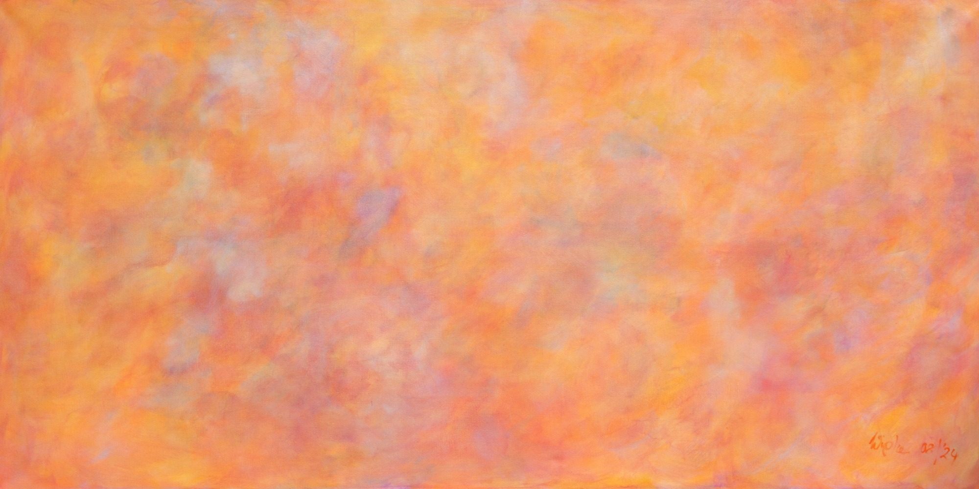 Dieses großformatige Acrylbild entfaltet sich als weit gespannter Farbraum, in dem sich warme Orange-, Gelb- und Rosatöne zu einer atmosphärischen Oberfläche verdichten. In zahlreichen lasierenden und weich ineinander übergehenden Farbschichten entsteht eine vibrierende Struktur, die an Licht, Wärme und flüchtige Himmelsphänomene erinnert.