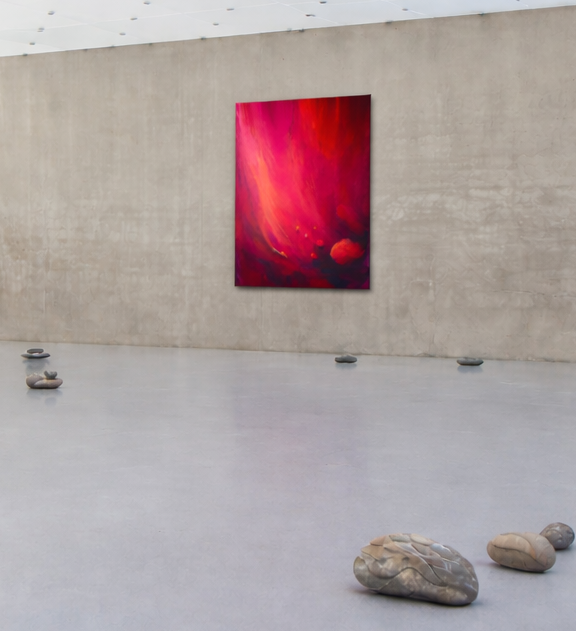 In der unteren Bildzone erscheinen kleine, leuchtende Formen, die an Steine, Glutstücke oder Inseln erinnern. Sie wirken wie ruhende Punkte inmitten einer kraftvollen Farbbewegung. Diese Kontraste zwischen ruhigen Formen und dynamischen Farbbahnen verleihen dem Bild eine besondere Spannung.