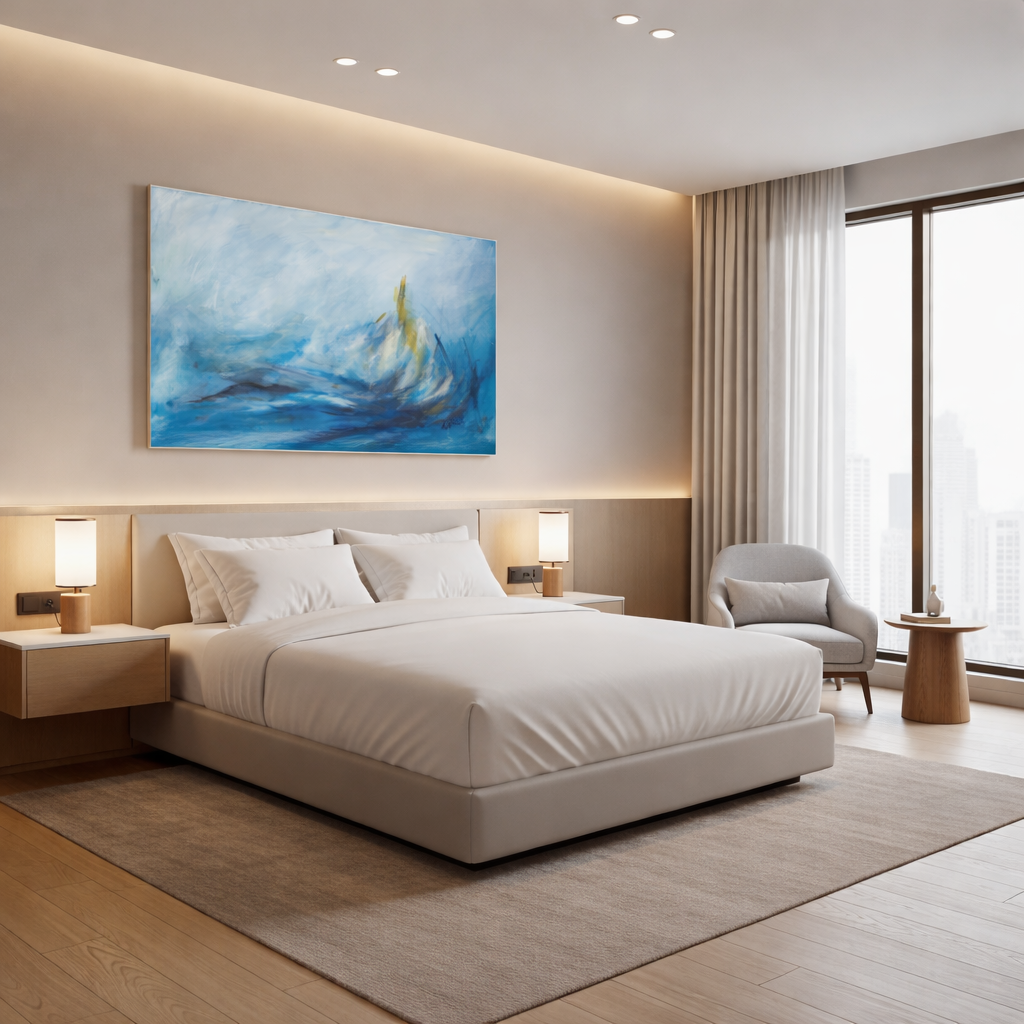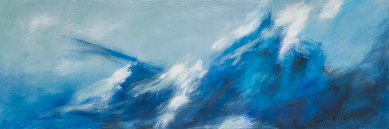 Die Malerei bewegt sich zwischen Abstraktion und Landschaft. Sie erinnert an das Meer, ohne es konkret abzubilden. Stattdessen entsteht eine Stimmung von Weite, Stille und Bewegung – ein Moment zwischen Himmel, Wasser und Licht.