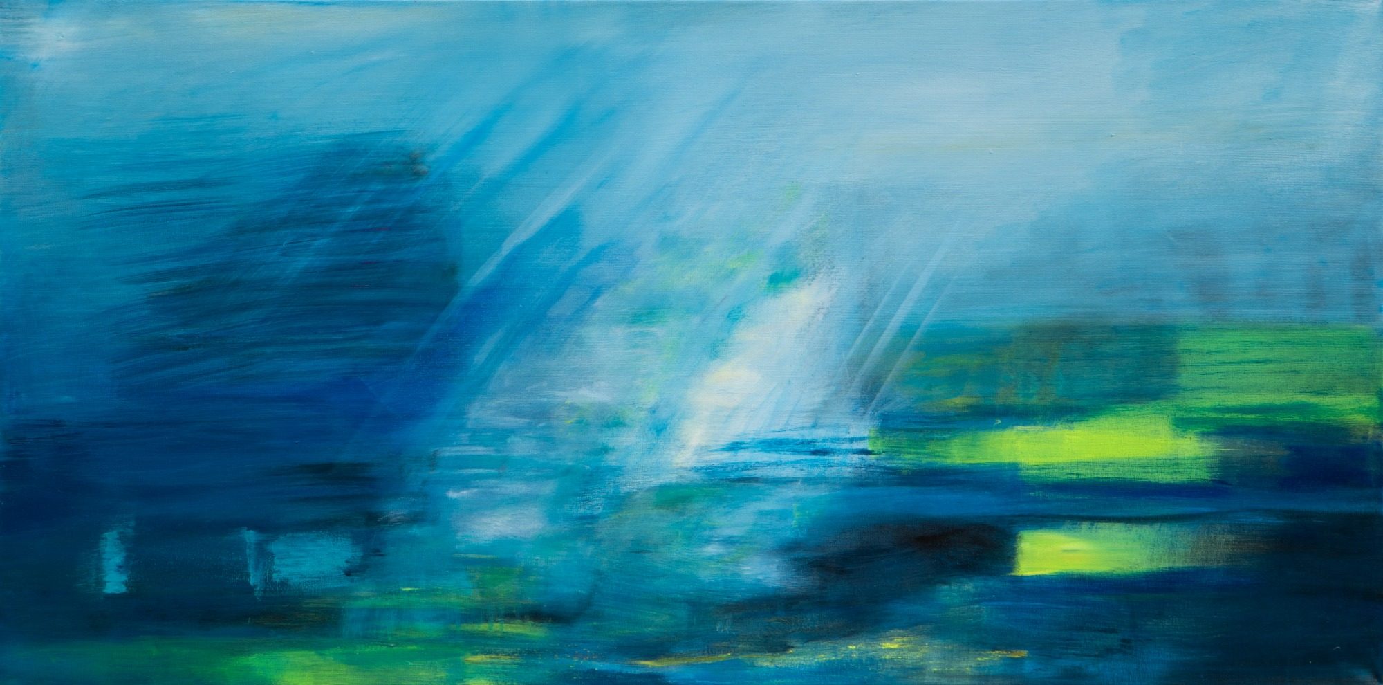 Die Arbeit entfaltet eine ruhige, weite Bildlandschaft aus Blau- und Grüntönen. Transparente Farbschichten und horizontale Bewegungen erzeugen den Eindruck von Wasserflächen und einem offenen Horizont. Durch die Bildmitte brechen helle Lichtstrahlen, die sich auf der Oberfläche spiegeln und dem Raum eine atmosphärische Tiefe verleihen.