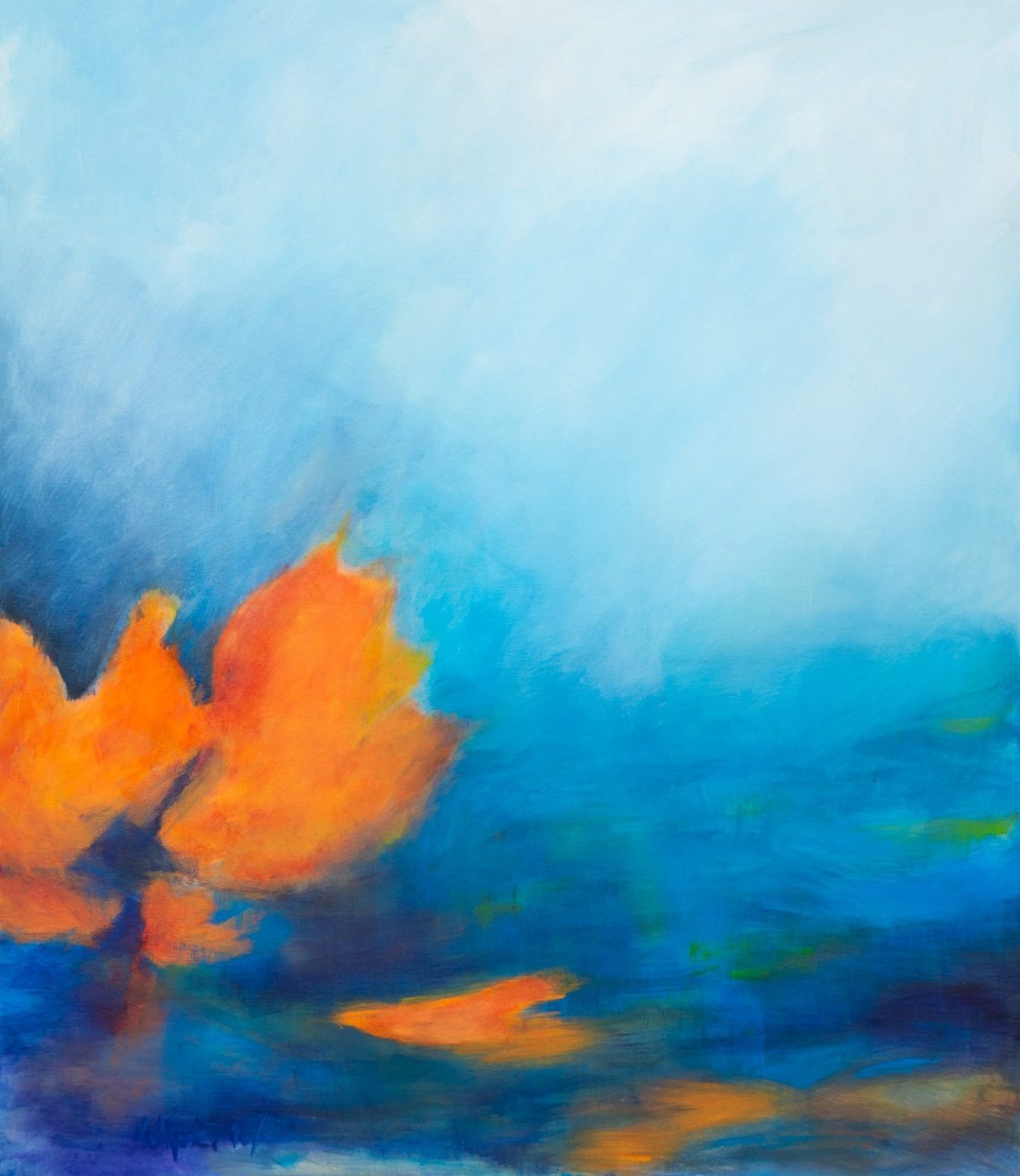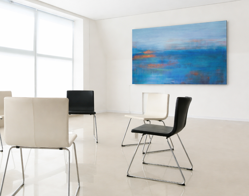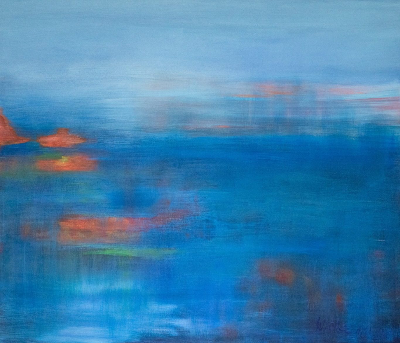 Die Malerei bleibt bewusst zwischen Abstraktion und Naturerinnerung angesiedelt. Ohne eine konkrete Landschaft zu zeigen, entsteht eine Stimmung von Weite, Stille und Licht – ein Moment zwischen Wasser und Himmel, in dem sich Raum, Farbe und Atmosphäre miteinander verbinden.