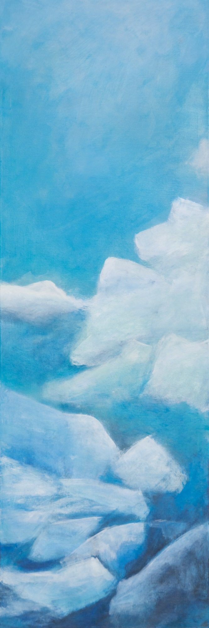 Das vertikale Acrylbild zeigt eine ruhige, fast entrückte Eislandschaft. Weißliche Eisblöcke scheinen im kalten Blau des Wassers zu treiben und bilden eine fragile, schwebende Struktur zwischen Oberfläche und Tiefe. Der Himmel und das Wasser gehen nahezu ineinander über und erzeugen einen offenen, weiten Bildraum.