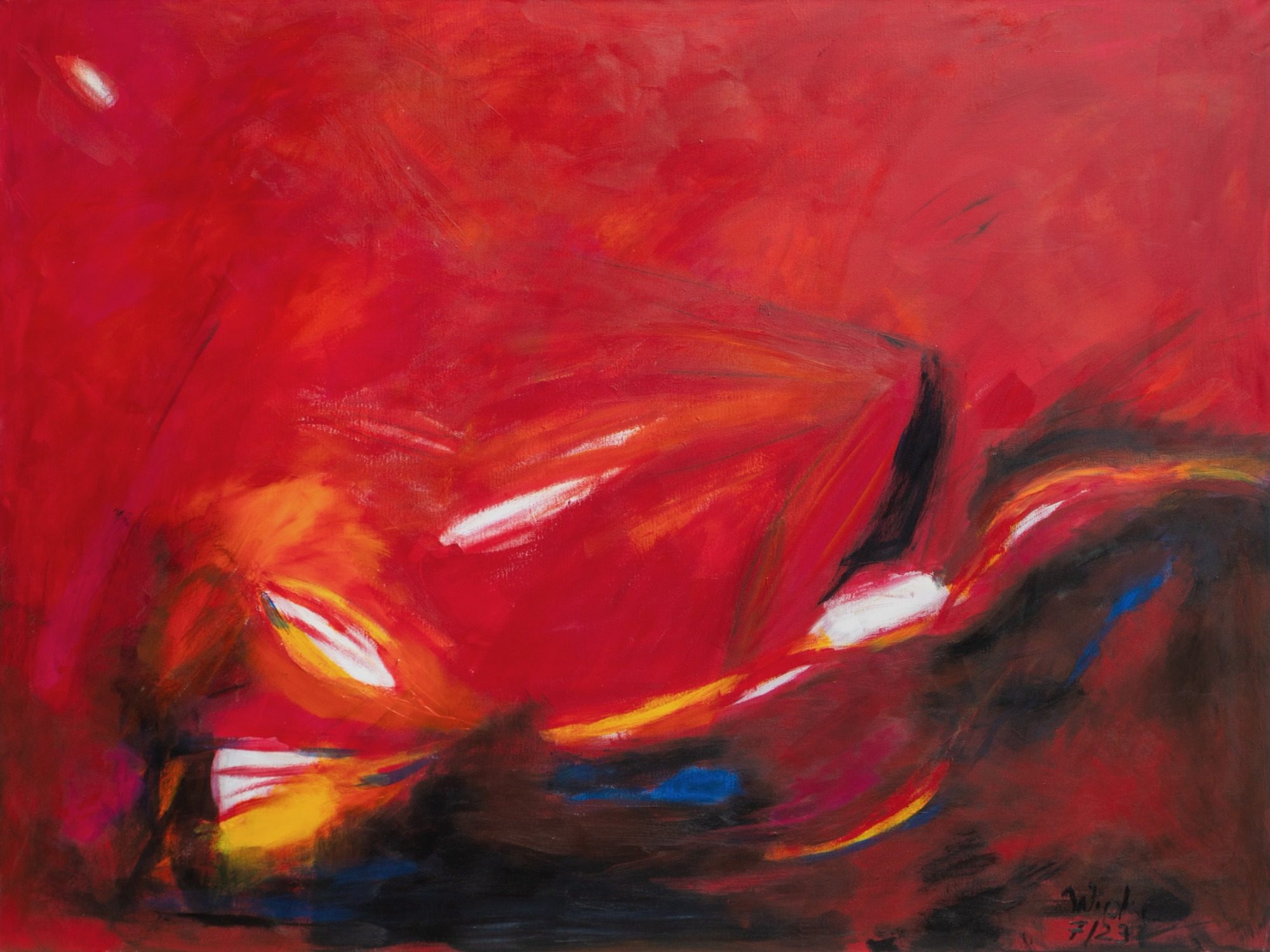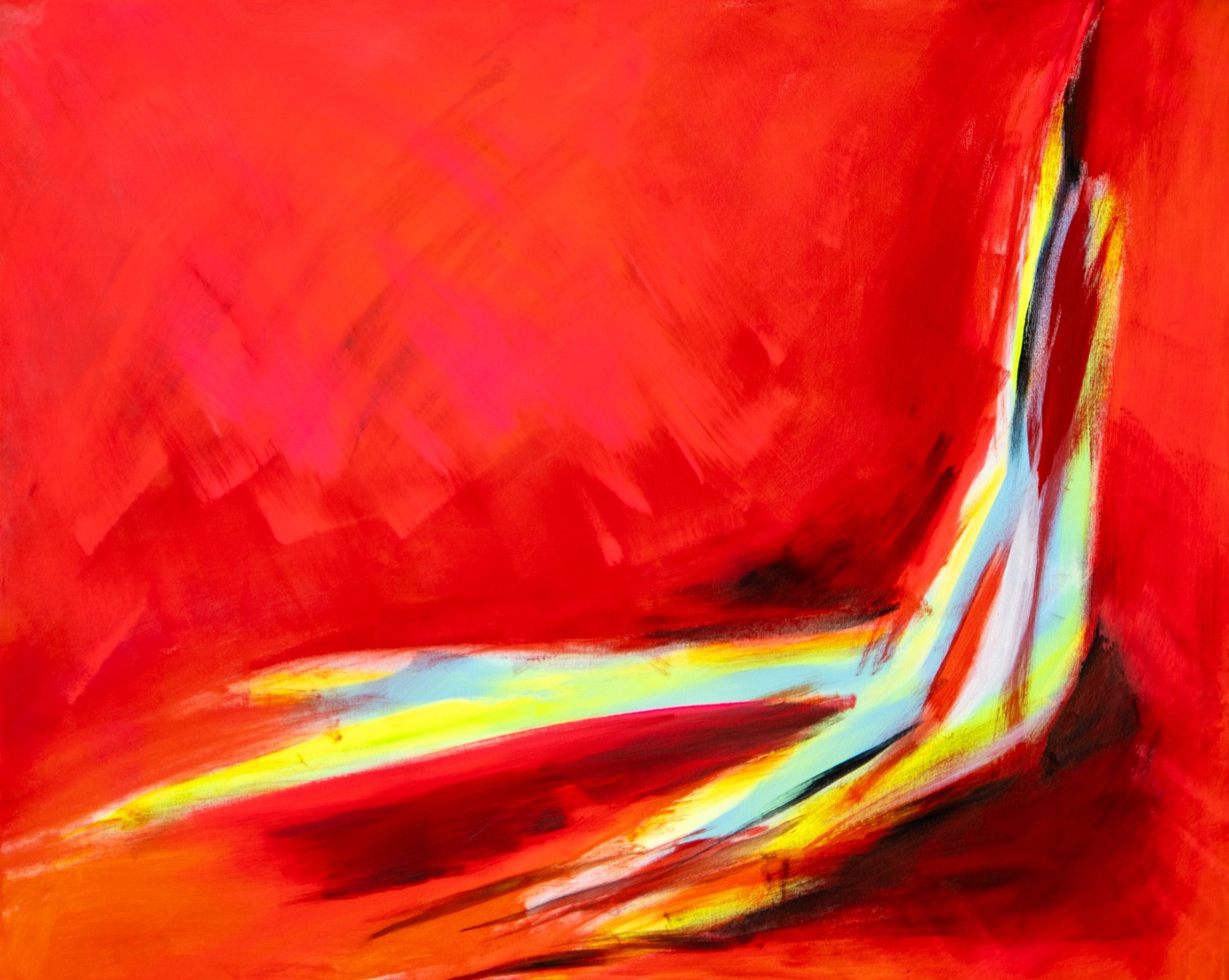 Die geschwungene Linie aus Weiß, Gelb und kühlen Blautönen durchzieht das Bild wie ein Impuls, der sich entlädt. Sie erinnert an eine Spur von Geschwindigkeit, an eine energetische Bahn oder an eine Bewegung, die gerade erst begonnen hat. Dabei entsteht ein starkes Zusammenspiel zwischen der ruhigen Fläche des Rot und der konzentrierten Dynamik der Form.