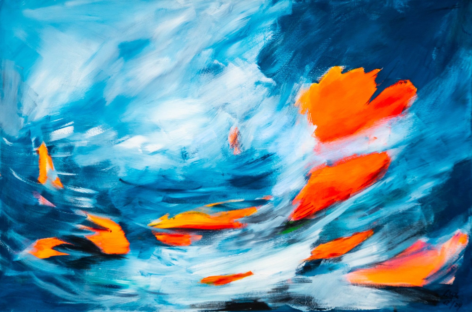 Dagegen setzen die leuchtenden Orange- und Rottöne starke, impulsive Akzente. Sie wirken wie Funken, Segel oder Fragmente von Energie, die durch die Bewegung getragen werden. Diese Farbfelder scheinen sich vom Hintergrund zu lösen und treiben durch das Bild, als würden sie einem inneren Rhythmus folgen.
