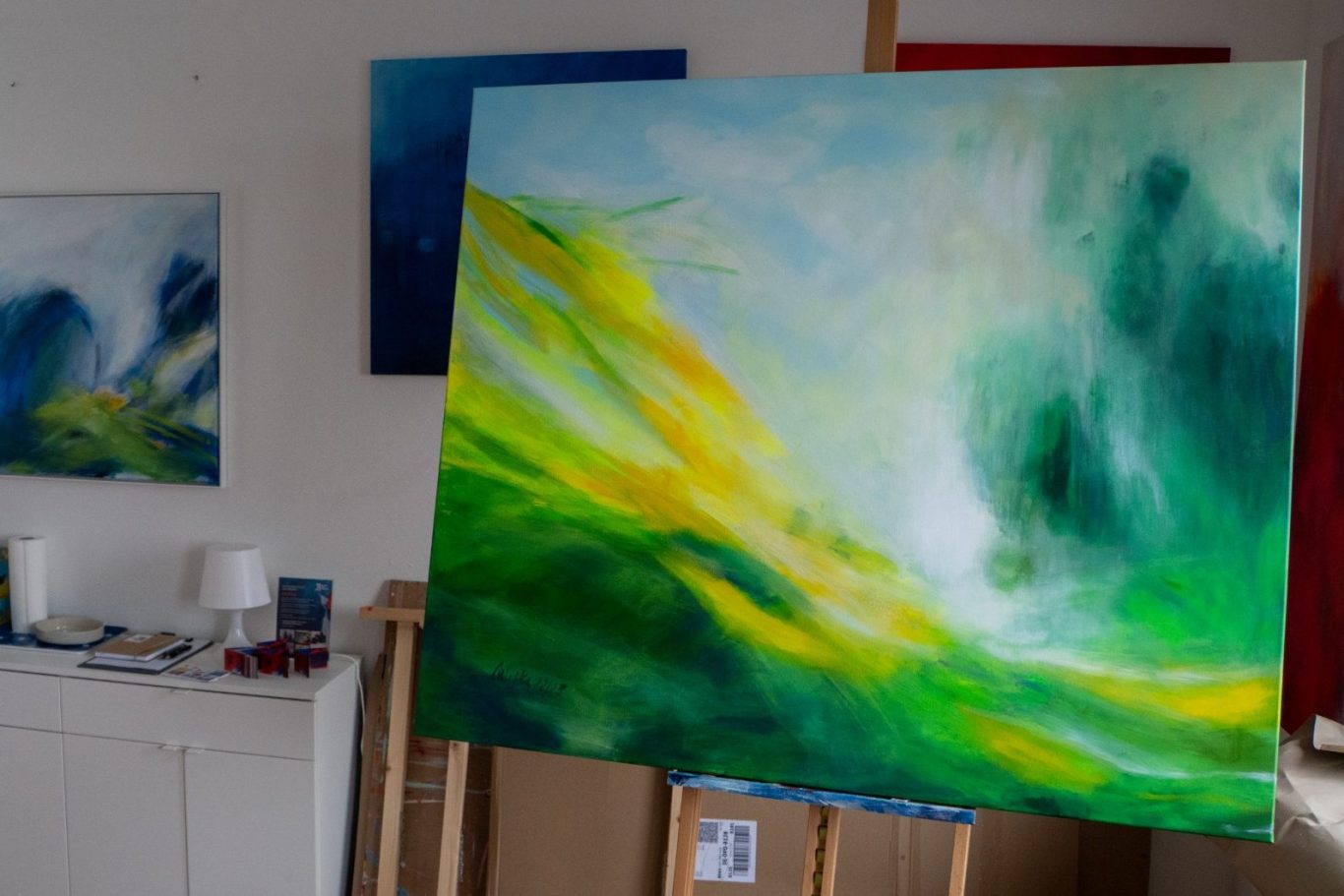 Die intensiven Grün- und Gelbtöne erinnern an Vegetation, Sonnenlicht und frische Landschaft. Sie stehen für Wachstum, Veränderung und Neubeginn. Gleichzeitig öffnen die hellen, fast nebelhaften Bereiche einen weiten Bildraum, der zwischen Gegenständlichkeit und Abstraktion schwebt.