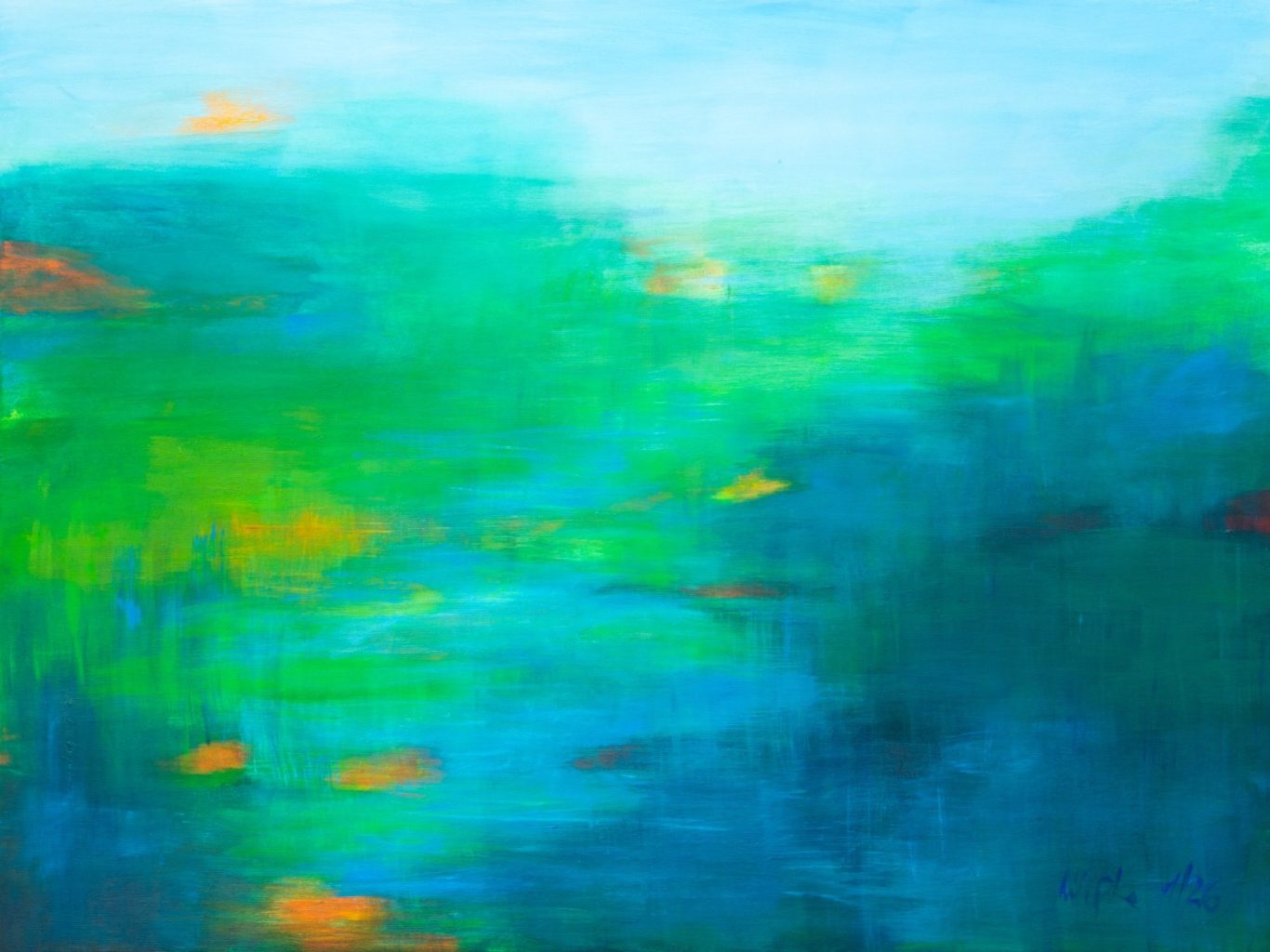 In der Arbeit „Zwischen Wasser und Himmel“ öffnet sich ein weiter, atmosphärischer Bildraum, in dem Blau- und Grüntöne sanft ineinander übergehen. Transparente Farbschichten fließen über die Leinwand und erzeugen eine schwebende Landschaft, die zugleich an Wasserflächen, Horizonte und Spiegelungen erinnert.